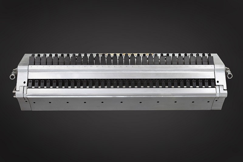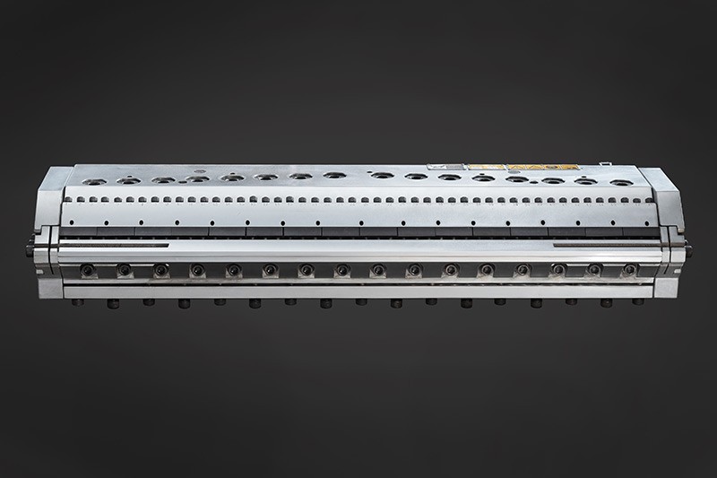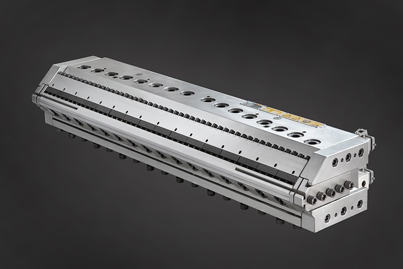 多流道多層模內(nèi)共擠模頭,每個流道為特定的物料專用設(shè)計,與分配器復(fù)合相比,模內(nèi)復(fù)合模頭使得各種原料更均勻的復(fù)合比例。各層獨立溫度控制、帶有隔熱裝置。