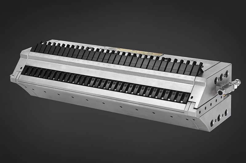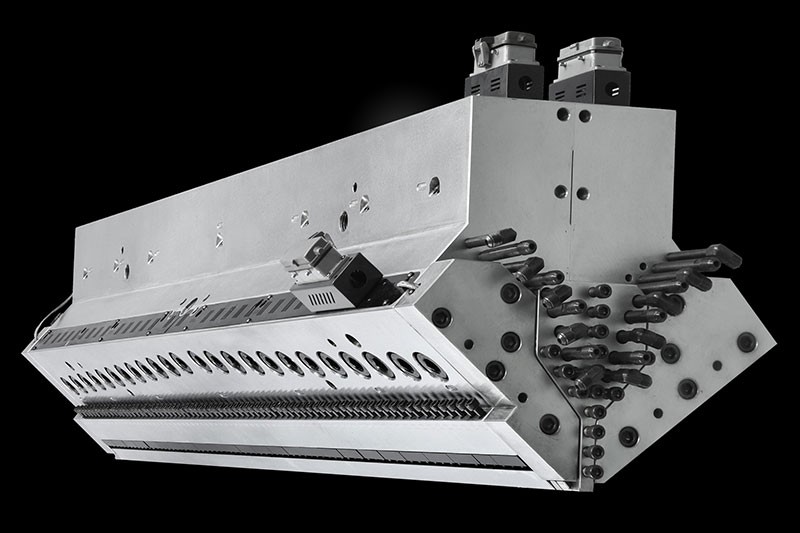 帶有上模唇全推式可調(diào)裝置,可生產(chǎn)0.1-2.5mm的片材制品,模頭內(nèi)部采用衣架式流道設(shè)計。