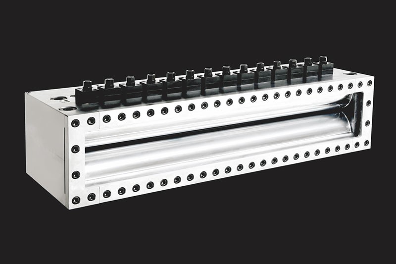 模具內(nèi)部采用衣架式流道,模具采用45度斜阻流棒調(diào)節(jié)裝置,方便調(diào)節(jié)模頭內(nèi)部的流量大小及快慢,采用全套不銹鋼耐高溫加熱管恒溫裝置,以最大限度的節(jié)省耗電量。