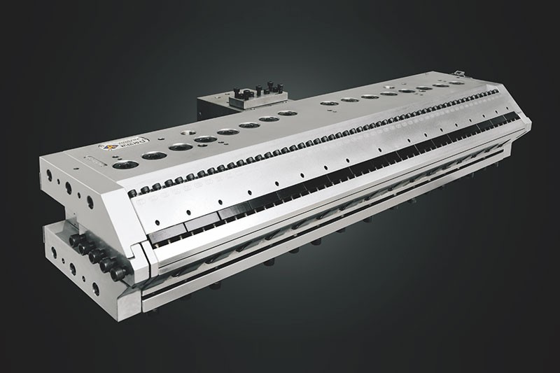 在模唇部可得到連續(xù)無阻攔的流面,裝有微小間隔的調(diào)節(jié)螺釘對樹脂的壓力與金屬的上下反彈起作用,可彎曲模唇以調(diào)節(jié)??陂g隙。