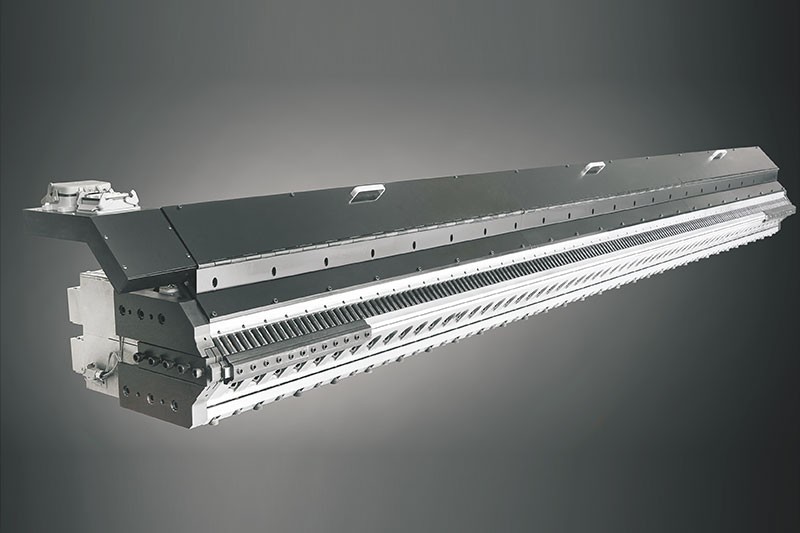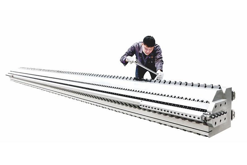 帶有45度的阻流條,可對料流進行調(diào)整。適用生產(chǎn)1-8mm的防水卷材。
